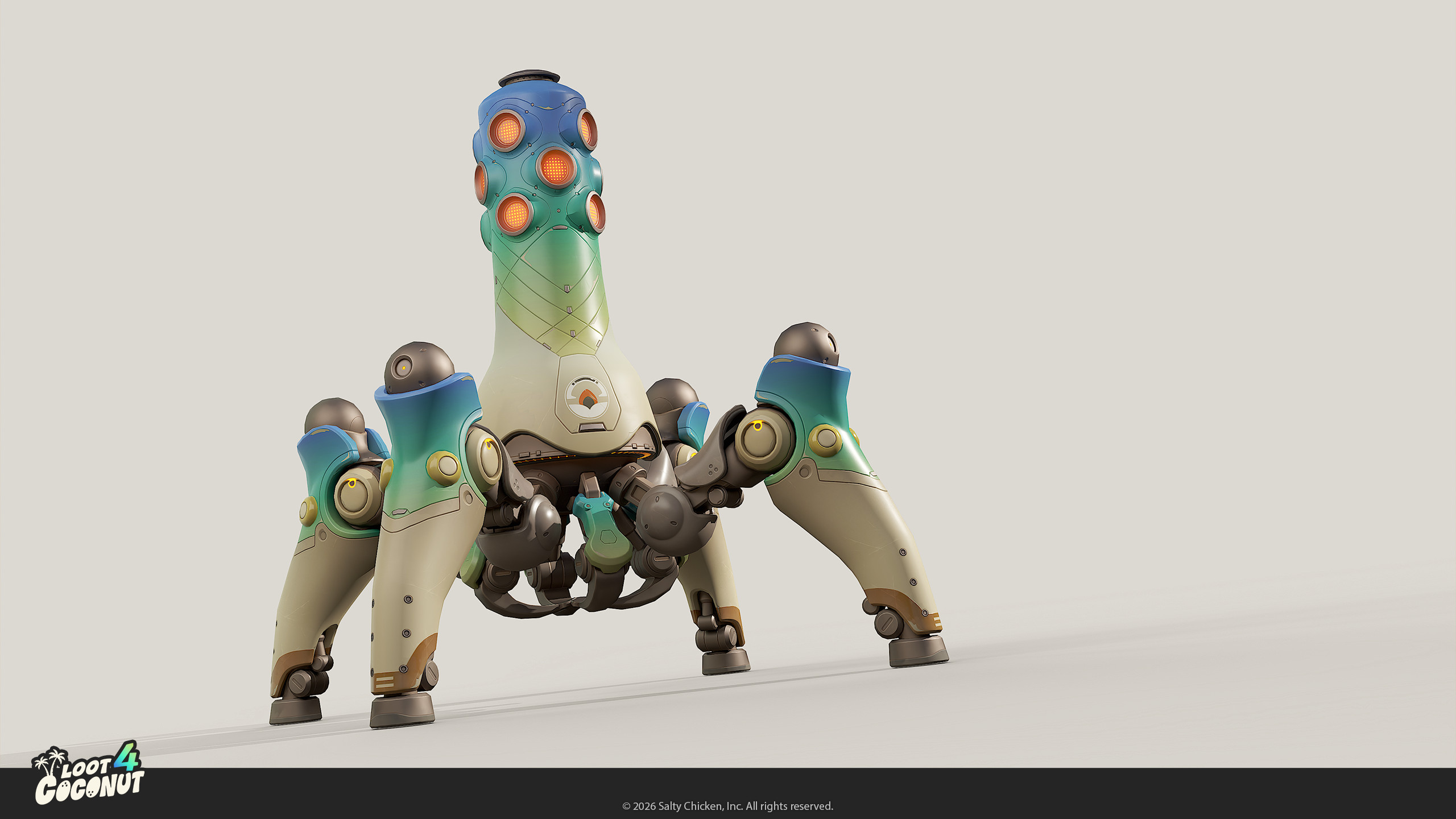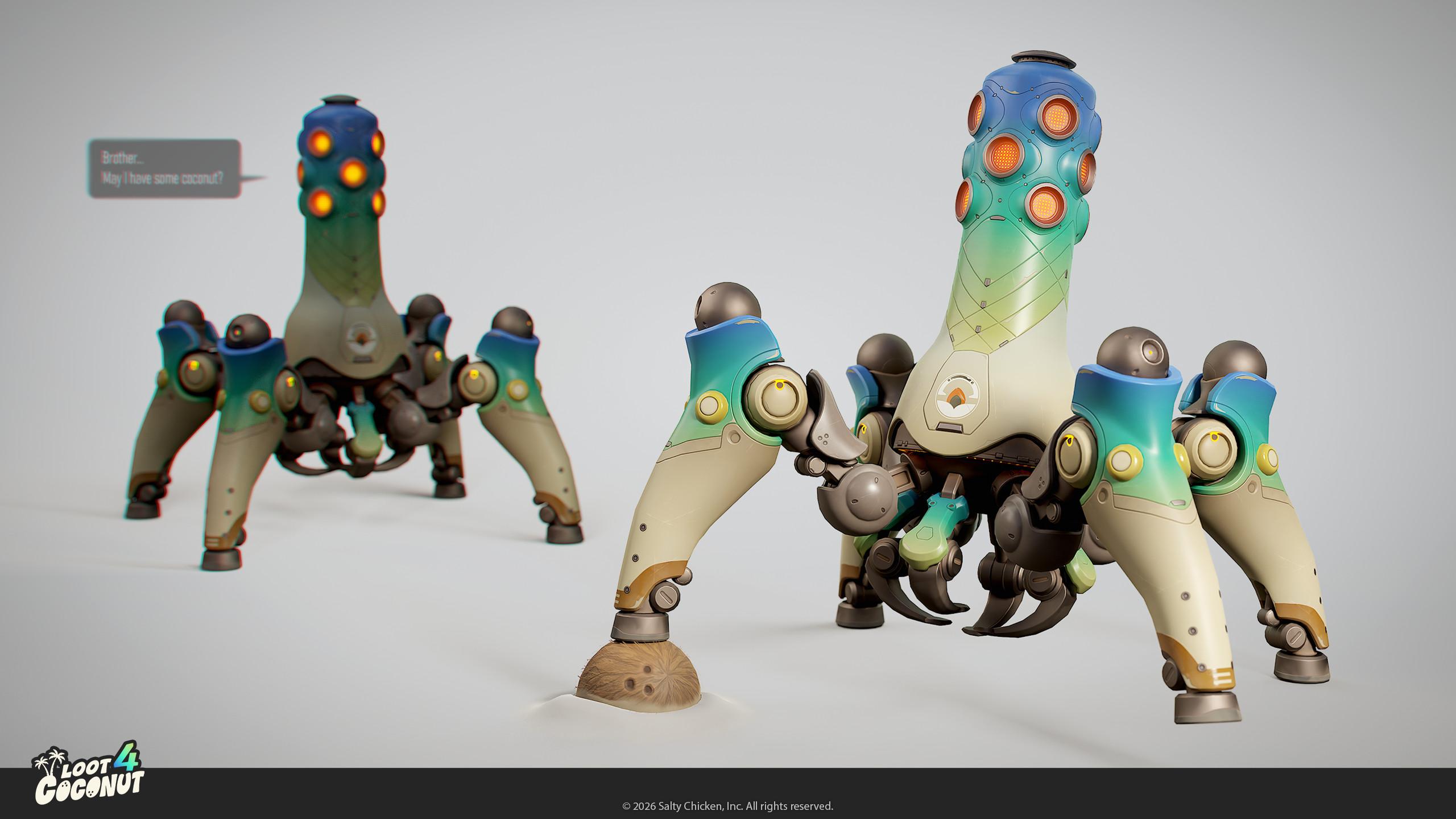 Loot 4 Coconut is a game prototype / study by me and Adiyar Aidarbekov. What originally started as a simple 3D portfolio piece (inspired by the amazing robot concept by Sasha Tudvaseva - turned out to be fertile ground for gameplay ideas, lore, visual identity and branding: It was a great excercice to try and develop a vertical slice.