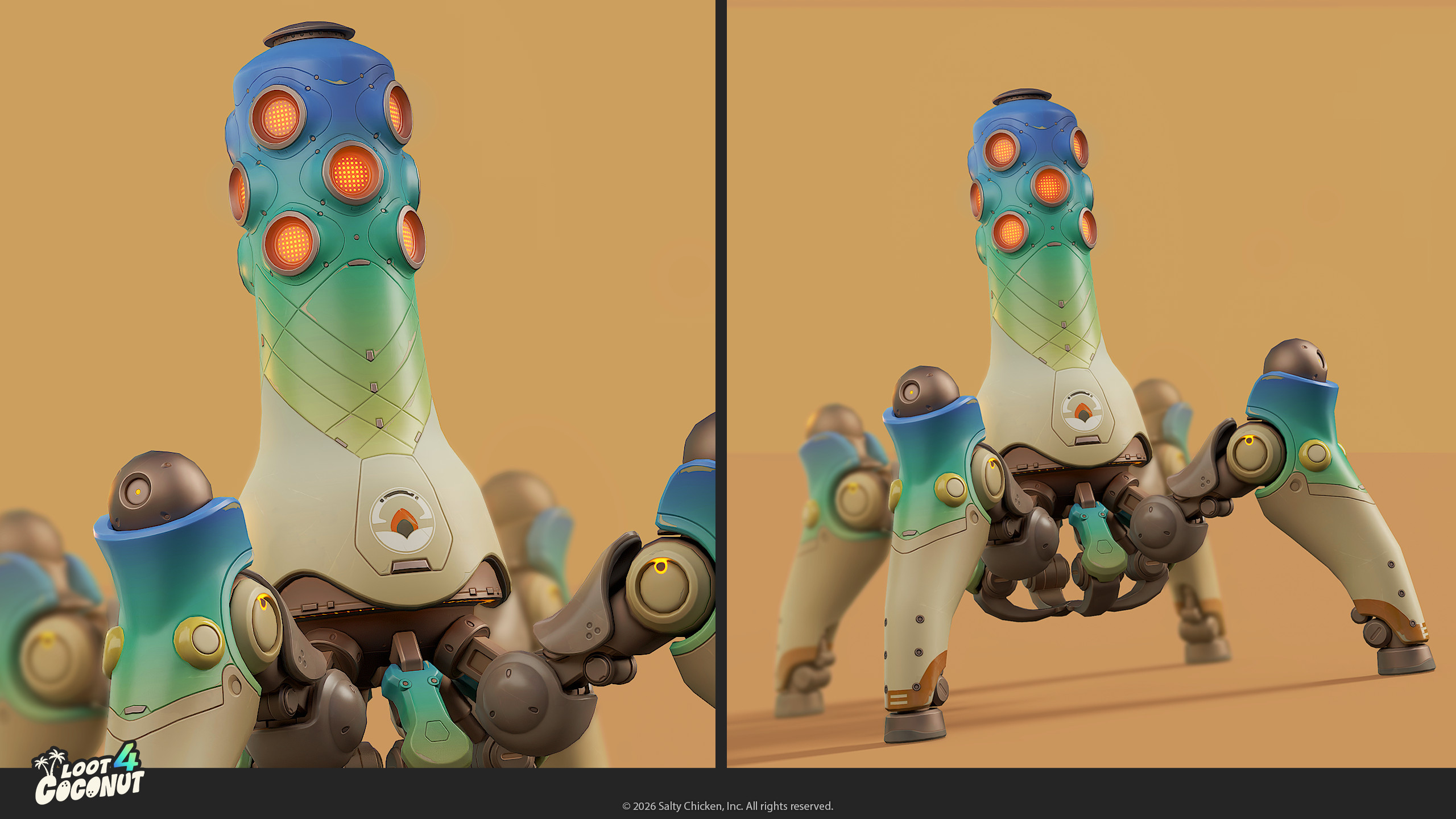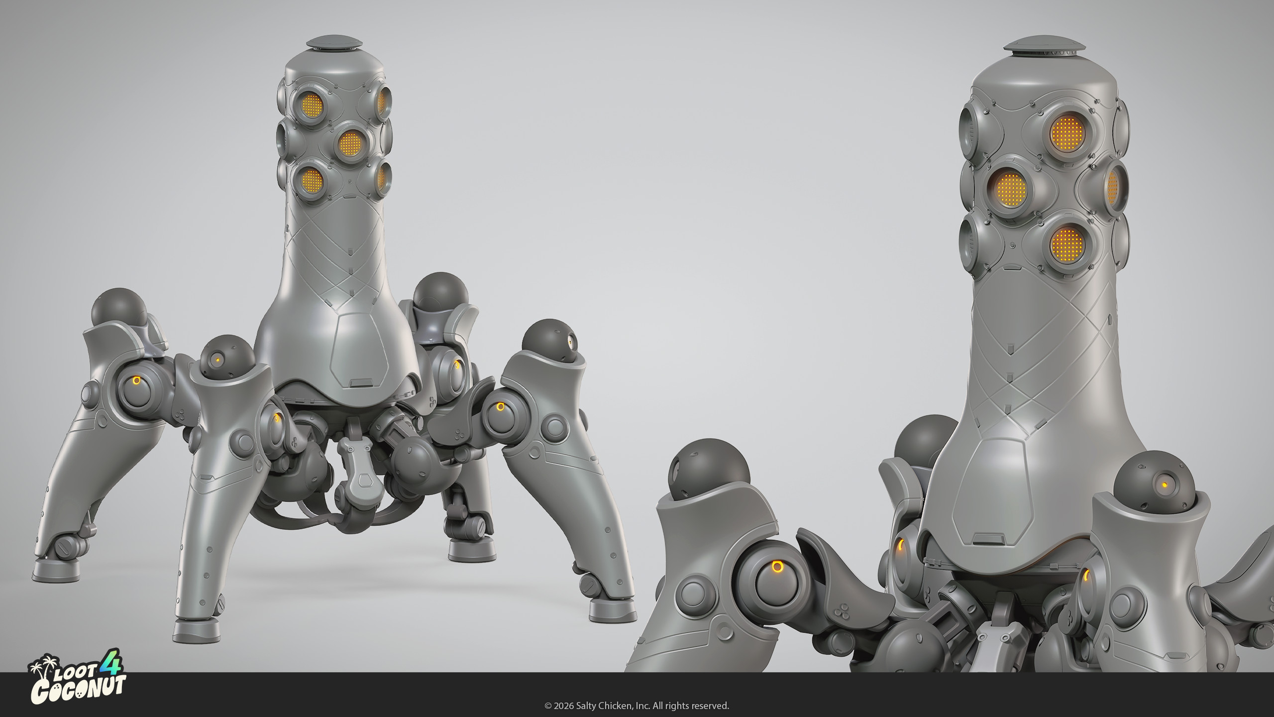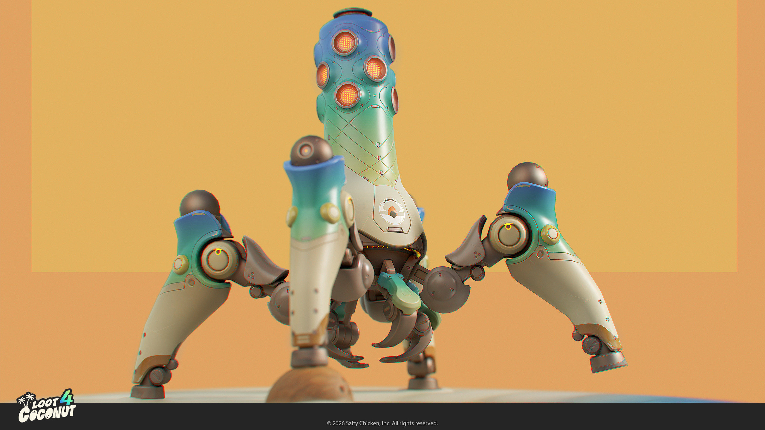 Loot 4 Coconut is a game prototype / study by me and Adiyar Aidarbekov. What originally started as a simple 3D portfolio piece (inspired by the amazing robot concept by Sasha Tudvaseva - turned out to be fertile ground for gameplay ideas, lore, visual identity and branding: It was a great excercice to try and develop a vertical slice.